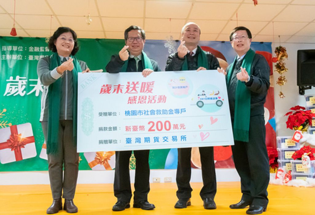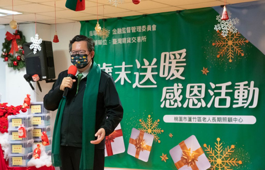 桃園市長鄭文燦今12月23日下午前往蘆竹區老人長期照顧中心,出席109年度「期交所歲末送暖感恩活動」暨公益捐贈儀式。鄭市長表示,期交所雖為金融服務業,但秉持「金融有愛、回饋社會」的社企精神,於今(109)年捐贈蘆竹老人長期照顧中心10萬元「加菜金」,也捐贈市府「社會救助金專戶」200萬元,其中150萬元用於購置日照交通接送車,另外50萬元則運用在兒少發展帳戶獎勵金,也為每位長輩準備裝有保暖物品的聖誕幸福百寶箱。鄭市長感謝期交所發揮公益愛心及長年對社福的捐助支持,期交所6年來捐贈全臺各地食(實)物銀行及偏鄉學童課後輔導超過2億元,展現「善的循環」力量,給予社會滿滿溫暖。
