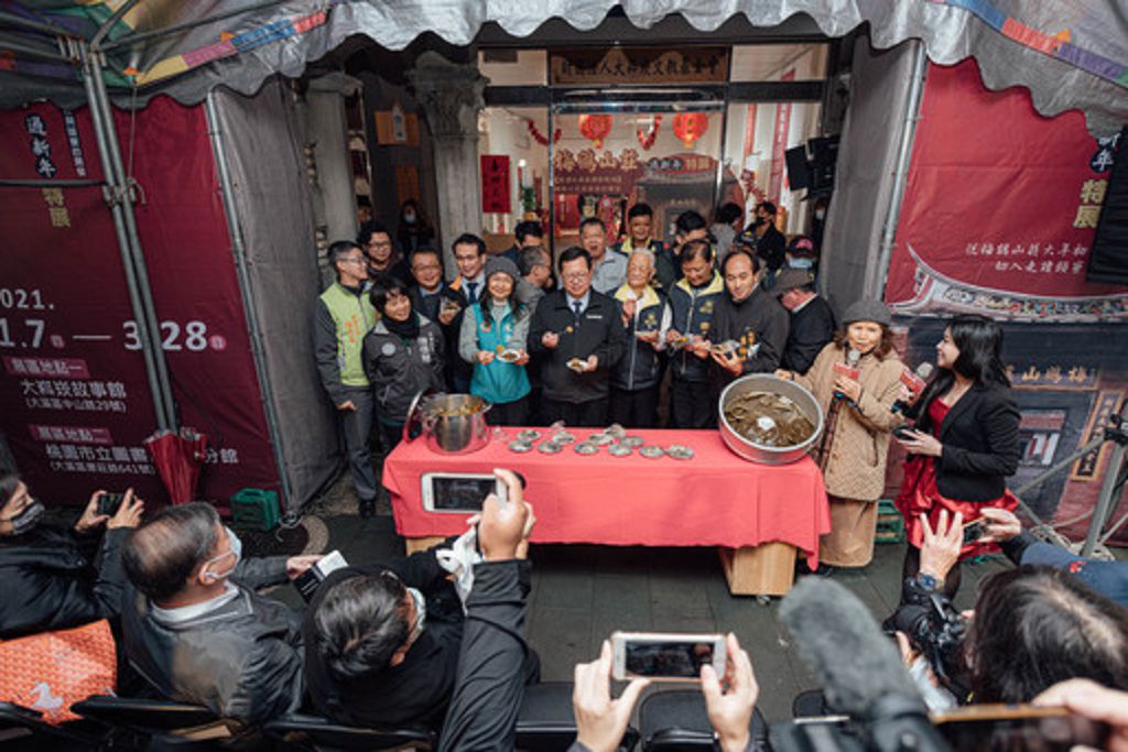 鄭市長提到,林家先祖林登雲當時擔任大嵙崁租館管事,並興建梅鶴山莊作為宅邸。每逢農曆春節,梅鶴林家有「行春」傳統,農曆初一子時拜天公、放鞭炮,並至福安宮敬拜頭香、在家祭拜神明祖先,再前往附近三座土地公廟拜拜,沿途與鄰居相互拜年。林家人也使用大溪韭菜製作韭菜糕,非常具有年節特色,邀請民眾在新春期間來大溪走春,透過展覽了解梅鶴山莊及大溪的歷史人文風情。